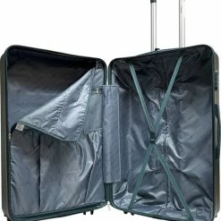 Middelgrote hardschalen koffer van het merk Benzi. De koffer is voorzien van een ritssluiting rondom die op slot te zetten is middels een vast cijferslot op de zijkant van de koffer. Binnenin gevoerd, spanbanden en tussenschot met ritssluiting. Op het tussenschot zit een ritsvak en twee steekvakken voor het overzichtelijk opbergen van kleine reisaccessoires.