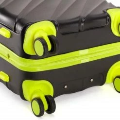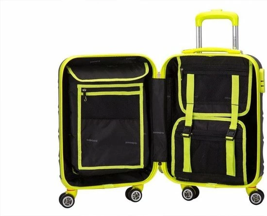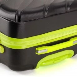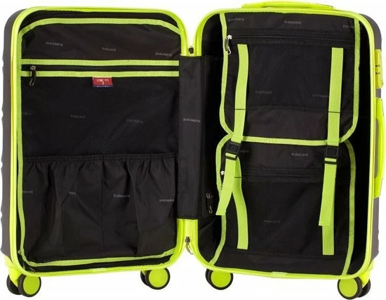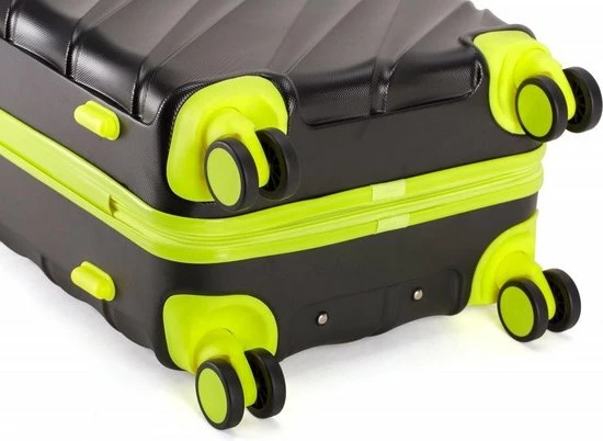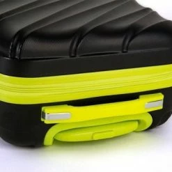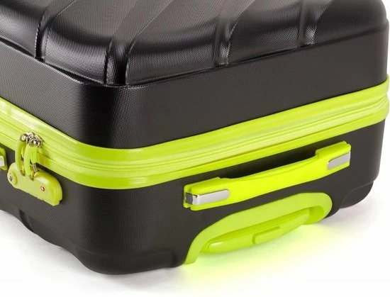 Hardschalen ABS handbagage koffer in kleur zwart met limegroene accenten. Koffer is voorzien van een rits rondom die op slot te zetten is middels een vast cijferslot op de zijkant van de koffer. Binnenin gevoerd en voorzien van meerdere insteek- en ritsvakken voor het overzichtelijk opbergen van uw bagage.
