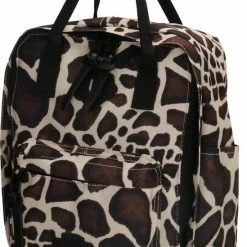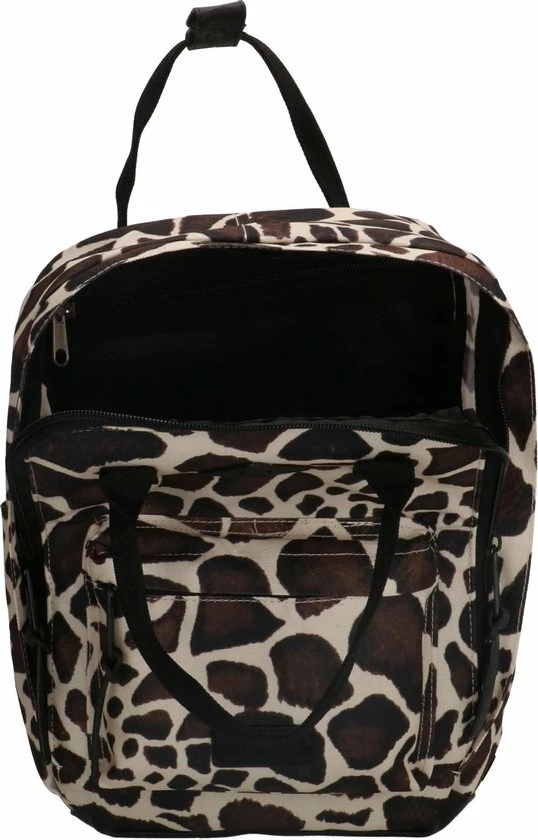 Klein maar toch opvallend leuk, is dit rugzakje uit de serie Londen van Enrico Benetti. De beestachtige goede giraffenprint en het moderne model maakt het tasje helemaal hip! De rugtas heeft een hoofdvak met tabletvak en apart ritsvakje. In het voorvak berg je kleine spulletjes op en de tas heeft aan beide zijden ook nog steekvakken. De tas is gemaakt van stevig polyester en afgewerkt met leuke zwarte kunstleren details. Enrico Benetti heeft binnen de Londen serie verschillende soorten en maten rugzakken beschikbaar in allerlei dierenprints!