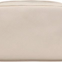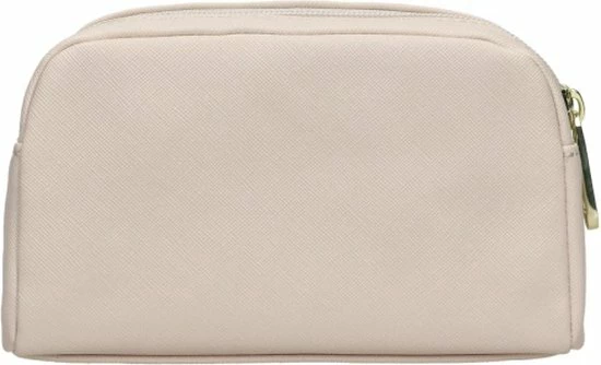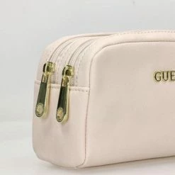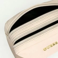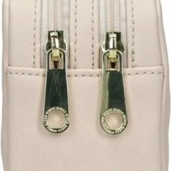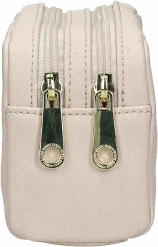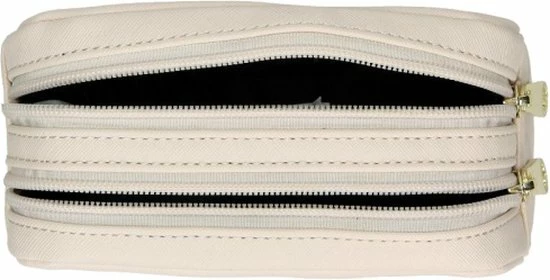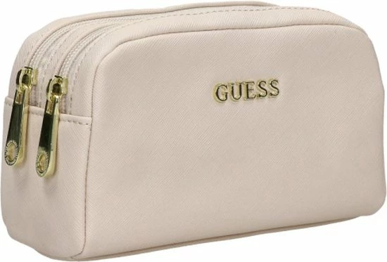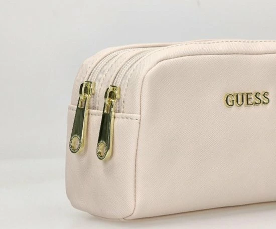 Met dit make-up tasje van het merk Guess in de kleur beige loop je helemaal fashion bij. In dit make-up tasje kan je geordend je cosmetica bewaren. De goudkleurig hardware geeft dit make-up tasje toch een chique uitstraling. Verder heeft dit make-up tasje twee compartimenten met een ritssluiting, waar je je essentials in kwijt kunt.
