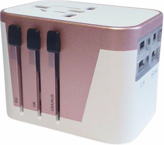 Universele reisadapter is geschikt voor het opladen van allerlei soorten apparaten. bijvoorbeeld voor tetefoons,laptops,camera’s, e-readers en nog veel meer. De reisadapter bevalt 4x USB poorten. voordelen: * Universeel en werkt in meer dan 150 laden * Tot 4 apparaten tegelijk opladen * Heeft totaal 4 USB poorten * Met veiligheidszekering Reisadapter specificaties * Input 100-240vAC-50/60Hz400mA * Totaal laad vermogen 8A * Gebruikt 8A veiligheidszekering * Maxpower : 800W op 110v,1840W op 230v * Behuizing materiaal : ABS +pc * Product foormaat 53mm L*50mm B *69mm H * Netto gewicht : 135g