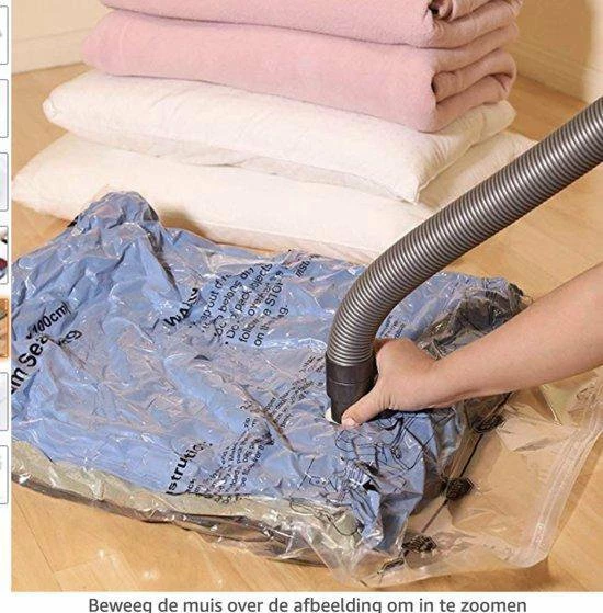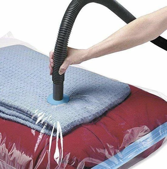 Met deze vacuΓΌm opbergzakken creΓ«ert u in een mum van tijd een zee van ruimte in uw kasten, opbergruimtes of koffer. Uw kleding, dekens en jassen opruimen? Met deze unieke set vacuΓΌm opbergzakken verdrievoudigt u uw opslagruimte. Bovendien zijn de opbergzakken luchtdicht, waterdicht en herbruikbaar. De inhoud wordt dus effectief samengeperst, optimaal beschermd en de spullen blijven keurig georganiseerd op hun plek.