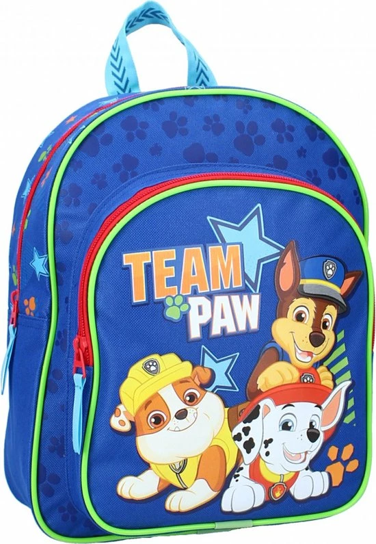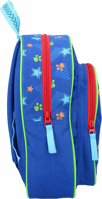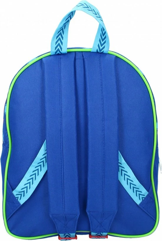 Deze donkerblauwe rugzak van Paw Patrol heeft leuke rode, lichtblauwe en groene accenten. Kijk maar eens naar de rode rits met lichtblauwe rits koordjes. In het midden rennen Chase, Marshall en Rubble je kleintje tegemoet en beschermen ze alle spulletjes die je in de rugzak opbergt. In het hoofdvak de grotere spulletjes, zoals de lunchtrommel voor op school of extra kleding voor bij de BSO. In het voorvakje kun je nog wat kleinere spulletjes kwijt. De rugtas is te dragen en op te hangen aan de lichtblauwe lus aan bovenkant. De schouderbanden zijn in lengte verstelbaar en gewatteerd.