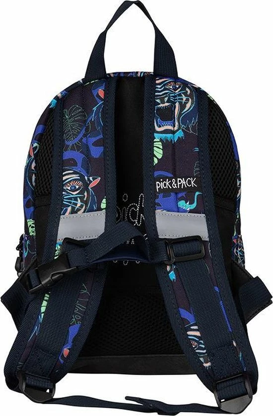 Kleine Pick & Pack rugzak in een stoere tijgerprint voor kinderen van 3 jaar en ouder. Dankzij het juiste formaat is de rugtas geschikt voor speelgoed, een lunchbox en alle andere kinderbenodigdheden. Voorzien van een speciale houder voor een drinkbeker. Aan de binnenzijde zit een klein ritsvakje en een adreslabel. Makkelijk voor als de rugtas eens ergens wordt vergeten! Voorop een borstbandje om de rugzak stevig vast te maken tijdens het lopen. De rugtas is ook voorzien van kleine reflecterende details zodat je kind in het donker opvalt. Dankzij de gewatteerde schouderbanden en het ergonomische rugdeel is de tas goed door het kind zelf te dragen.